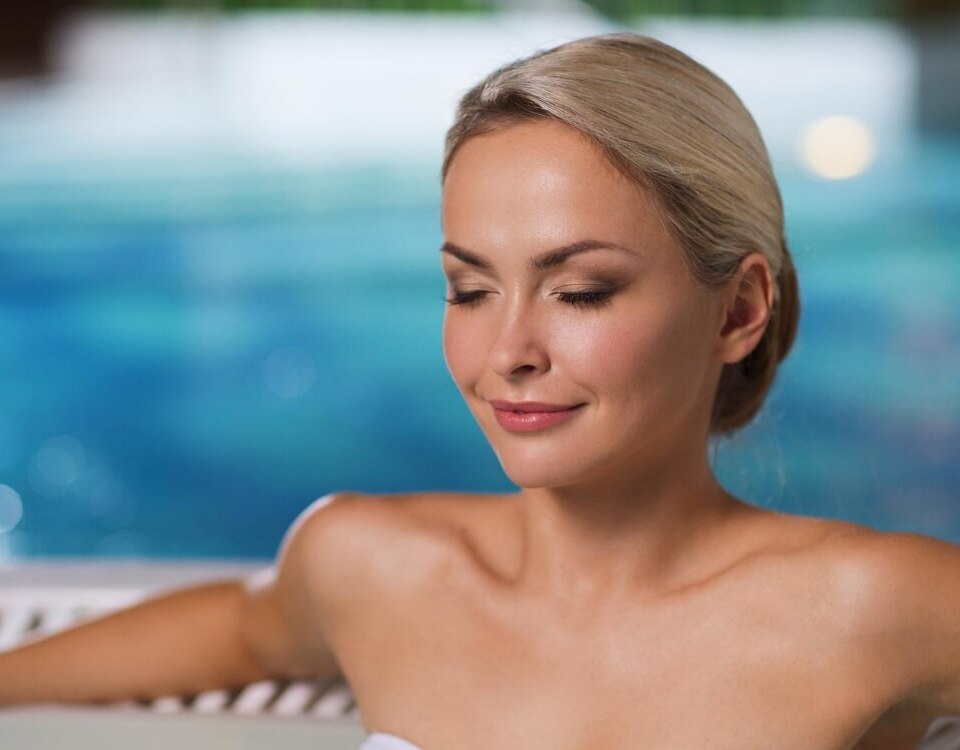 Przestronny, nowoczesny kryty basen hotelowy z leżakami i nastrojowym oświetleniem sufitowym
